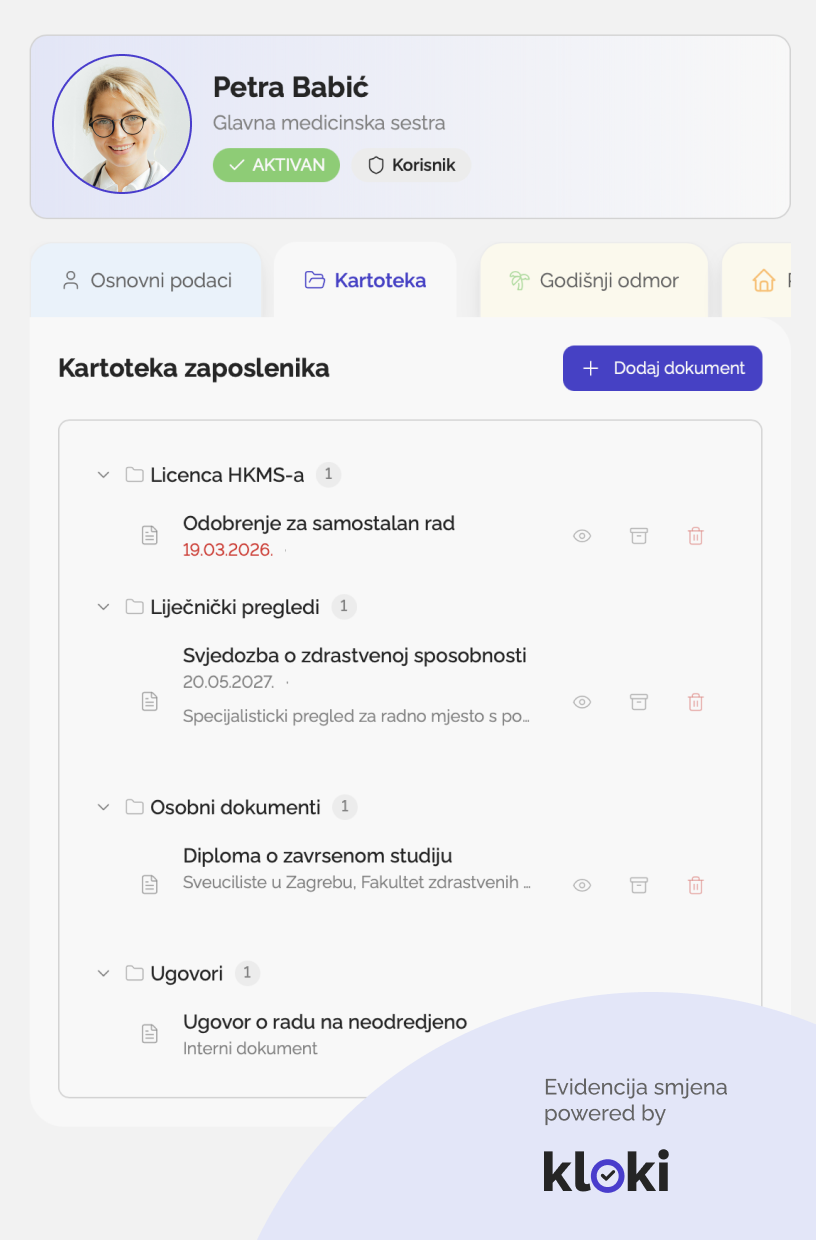 Digitalna baza certifikata unutar Klokija osigurava da vas sustav na vrijeme obavijesti o isteku licence, što je ključno za usklađenost sa zakonima i pravilnicima o zaštiti na radu (NN 71/14, 118/14, 154/14, 94/18, 96/18).