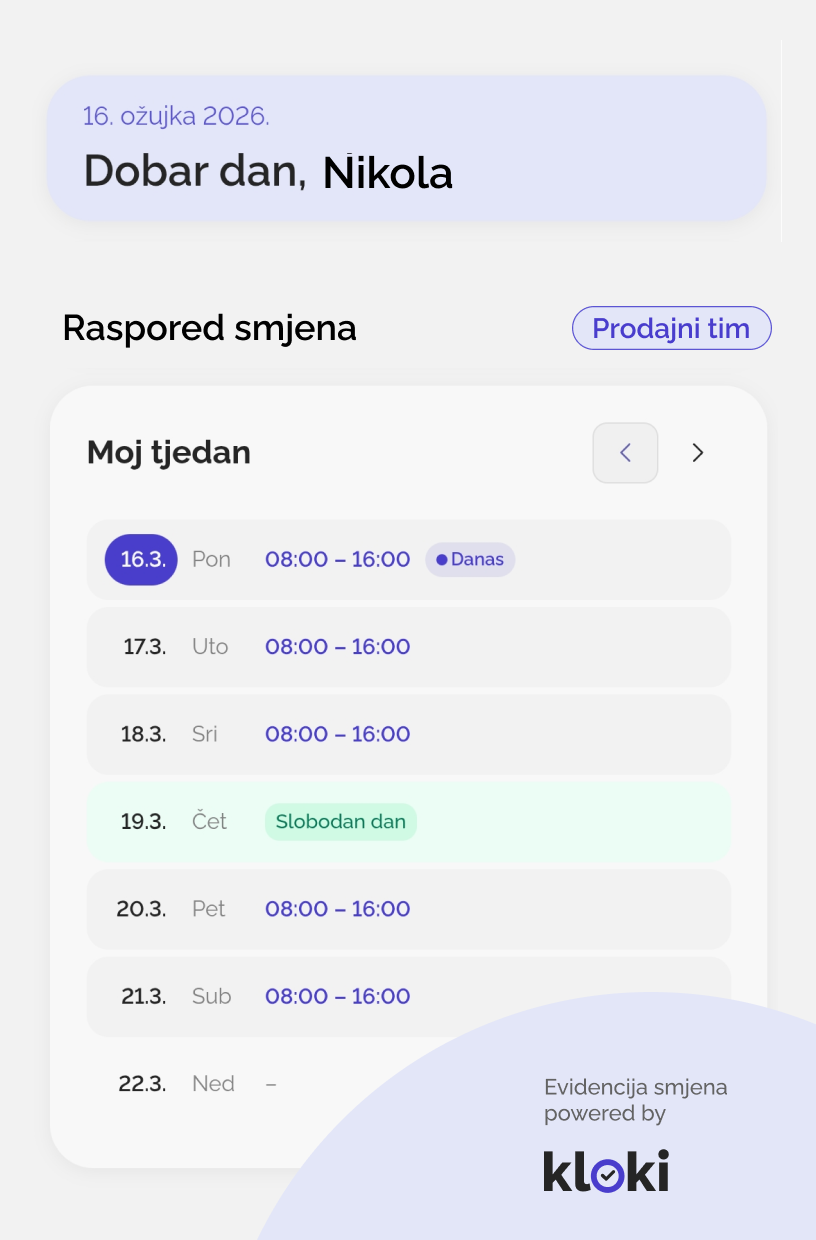 Prema Zakonu o radu (Narodne novine br. 93/14, 151/22, 64/23), svaki odrađeni sat mora biti evidentiran, a digitalni alati poput Klokija omogućuju automatsko generiranje izvještaja za plaće, smanjujući rizik od kazni koje mogu dosezati i 7.000 eura.