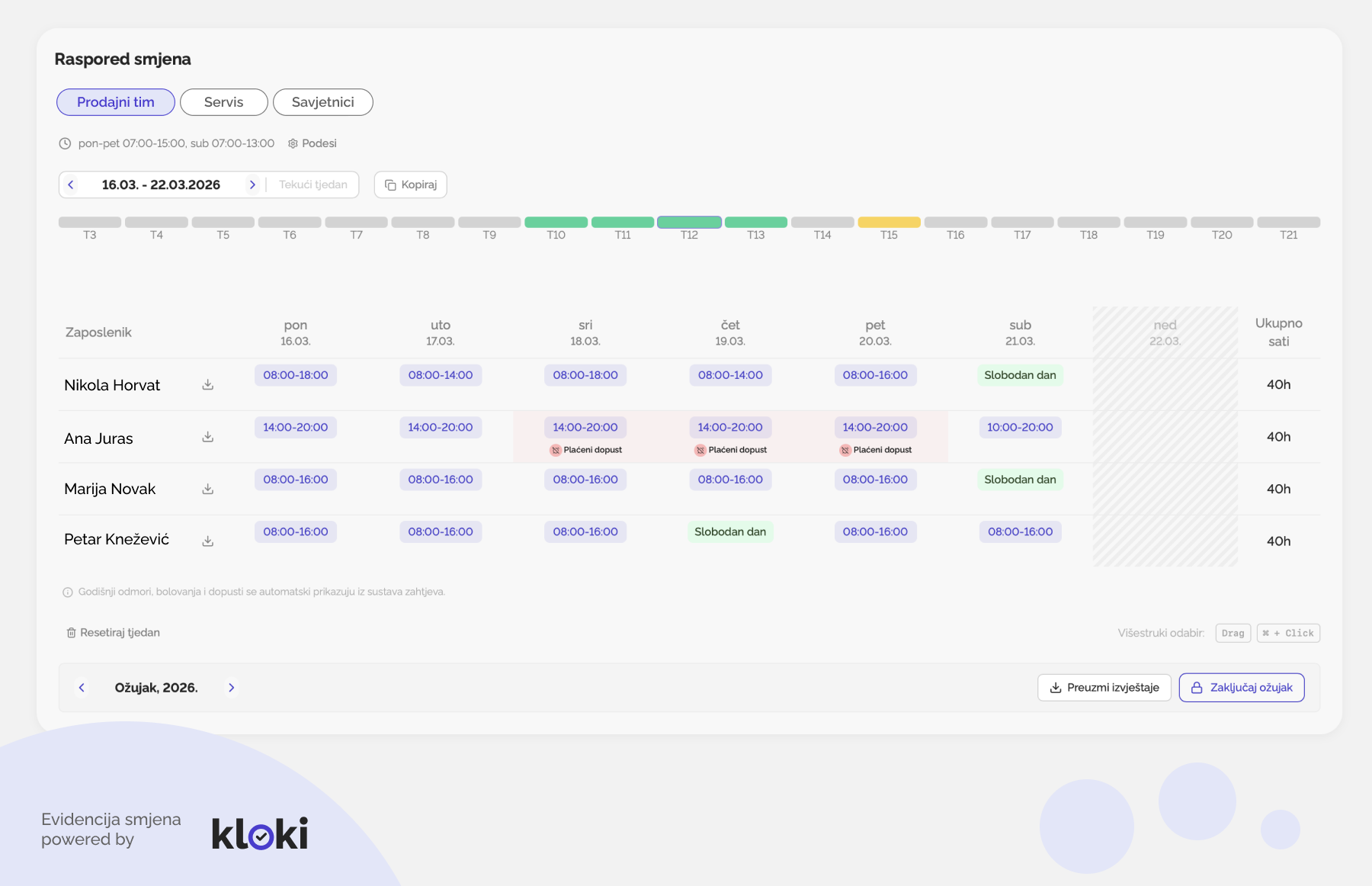 Problem nastaje kada se taj smjenski rad pokušava voditi u zastarjelim tablicama. Ručno upisivanje sati vodi do pogrešaka koje kasnije osjeti računovodstvo. Kvalitetna digitalna evidencija omogućuje da se radna smjena planira unaprijed, osiguravajući da je kontrola radnih sati transparentna i za poslodavca i za djelatnika.